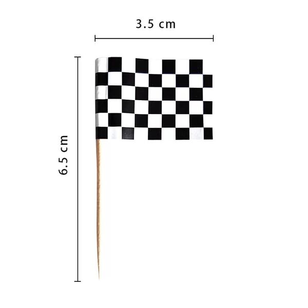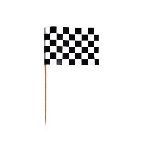 These toppers measure approx. 6.5cm tall and feature a classic double-sided black & white check flag design on wooden picks.
