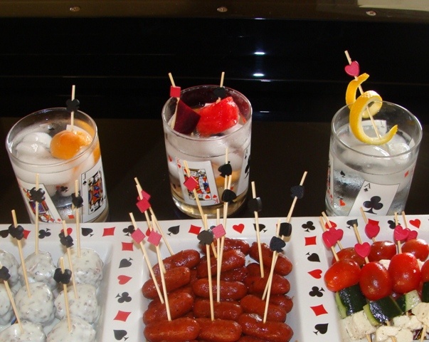 Now for the best part of every party - the party treats! Party finger food decorated with playing card toothpicks is sure to be a big hit, as well as some cupcakes decorated with red, black or white icing. Some red, black & white lollies would also work a treat, too! And for that extra touch to really impress your guests, why not decorate your food plates with some dice or playing cards? So easy, so impressive!
