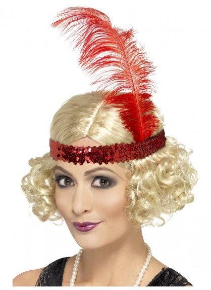 Blonde short curly flapper style wig with red headband + feather, designed to fit most adults.