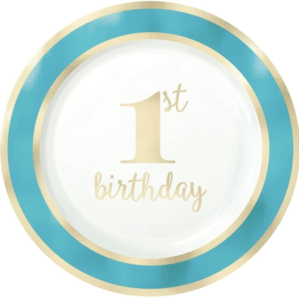 Pack of 10 1st birthday blue plastic plates, each measuring approx. 19cm in diameter.