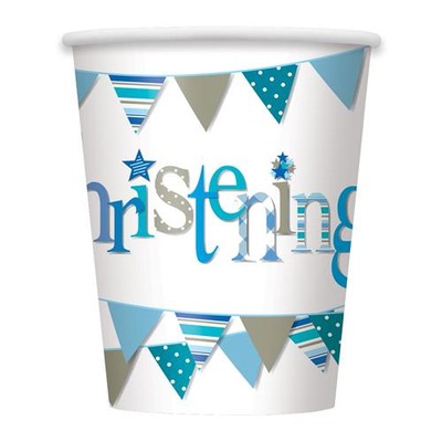 Pack of 8 blue Christening boy paper cups, each able to hold approx. 9oz. (270ml) of liquid.