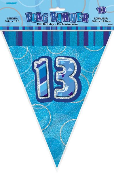Featuring sparkling blue & silver pennants each with the number 13, the banner measures approx. 3.6 metres long.