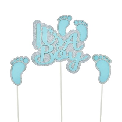 The larger topper features a silver glitter background with die-cut footprint decals and blue 'It's a Boy' wording while the 2 smaller toppers feature matching footprint designs.
