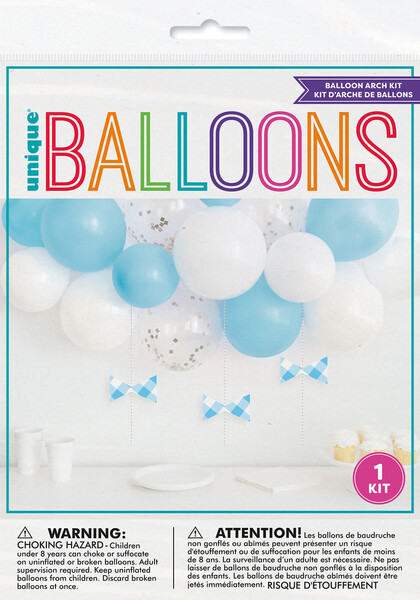 Get creative and make your own blue and white air-filled balloon arch with bow accents