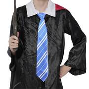 The tie is made from royal blue satin fabric with white diagonal stripes along its length. It is pre-tied and attached to a black elastic band to go around the neck.