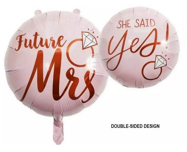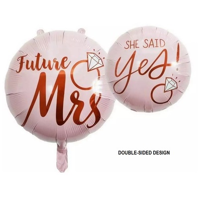 This blush pink douible-sided foil balloon features dual 'Future Mrs/She Said Yes!' messages and diamond ring accents - it will look great on its own or as part of a larger arrangement.
