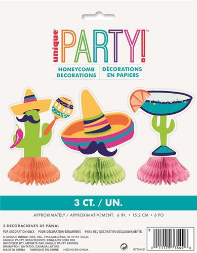 Pack of 3 Mexican themed honeycomb decorations, each measuring approx. 15.2cm in height. Some assembly required.