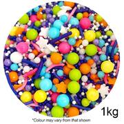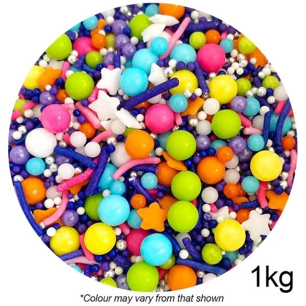 This bulk 1 kilogram resealable bag of edible sprinkles contains mixed colours and shapes - pink, blue, purple, white, orange, green, yellow, silver - jimmies, pearls, stars.