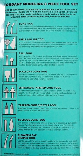 Fondant modelling tool set, perfect for creating realistic sugar flowers, leaves and other cake decorations! Each shaping tool measures approx. 13-16cm in length. Pack of 8.
