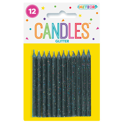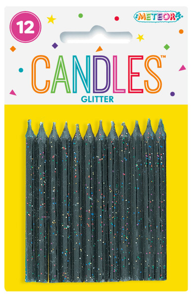 These black glitter candles are great for any kind of party cake! 12 in a pack, the candles measure 7cm. Please note that the glitter is not edible and may need to be removed from the cake before serving.