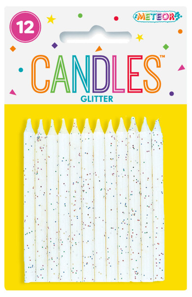 These white glitter candles are great for any kind of party cake! 12 in a pack, the candles measure 7cm. Please note that the glitter is not edible and may need to be removed from the cake before serving.