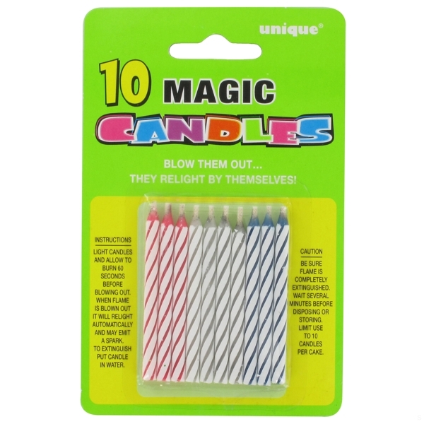 Amaze your family and friends! Blow these multi coloured candles out and they relight by themselves!
