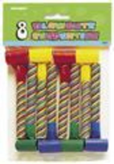 Pack of 8 candy striped blowouts to help the guests at your party celebrate! Sure to be a big hit! These blowouts do not whistle