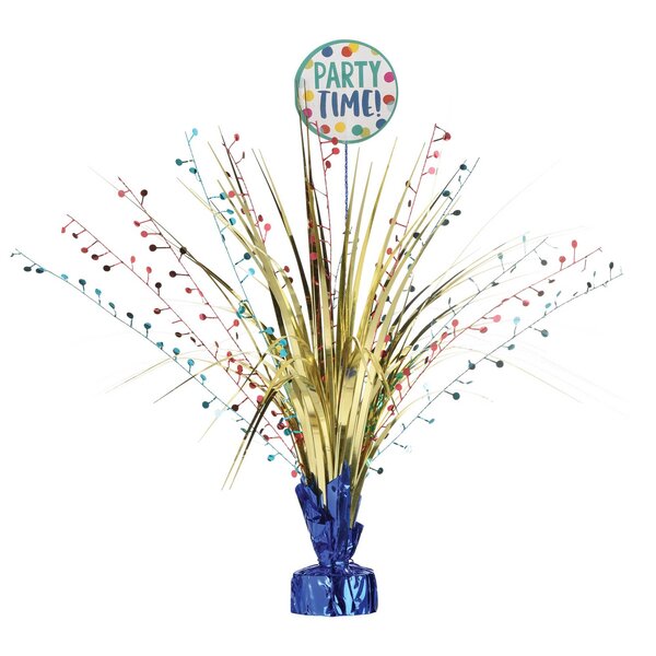 Blue base weight with cardboard 'Party Time' pick in the centre surrounded by teal and red dot and gold grass decoration - perfect as a table centrepiece by itself or with balloons attached!
