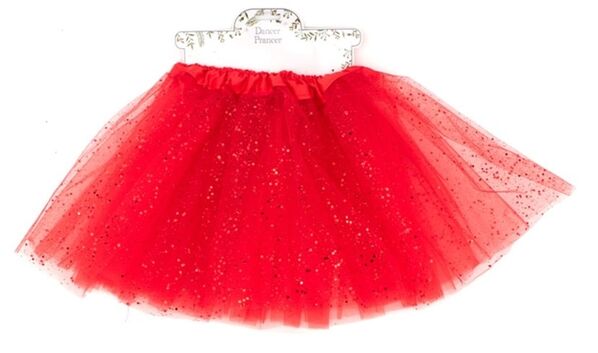 It has three layers of soft red tulle with a fourth top layer of stiff tulle sprinkled with sparkling red glitter of various sizes to create a sparkly, eye-catching tutu.