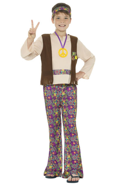 This child hippie boy costume is perfect for any costume party, especially for a Book Week celebration! This costume includes top, attached waistcoat, trousers, medallion and headband. Costume is a size medium (approx. 7-9 years old, 130-143cm in height.) Easily coordinated with the rest of our costume supplies to ensure that the costume is one to remember!