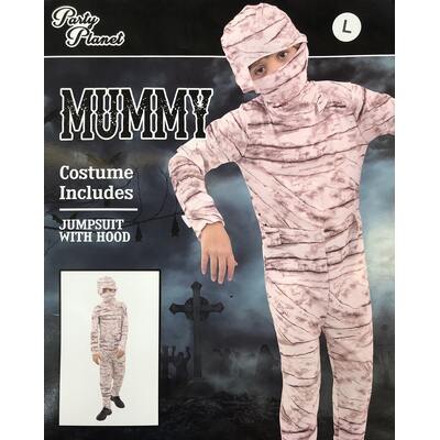 It is made from ivory stretch fabric printed with a wrapped bandage design and features short tatters of fabric attached to the waist, sleeves and hood. The attached hood has a large slit across the front to see through. The costume is easy to put on and remove with a long zip at the back that extends into the hood for easy access.