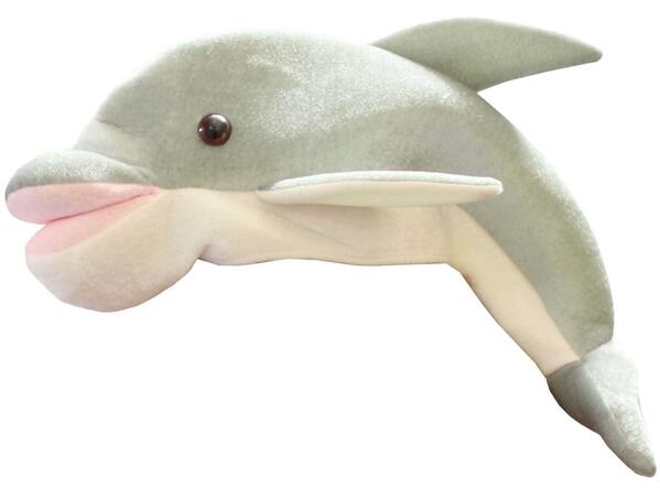 Made from grey & white plush fabric, it features a padded mouth, fin and tail.