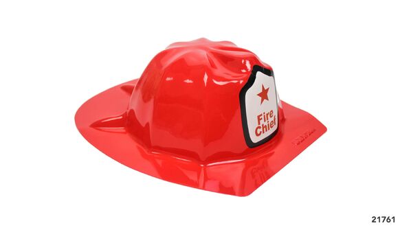 This cute hat is made from bright red moulded plastic and features an all-round flat brim and a Fire Chief decal sticker on the front.