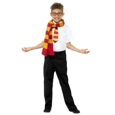 Child school boy costume kit. Kit includes a scarf, tie and lensless glasses. Designed to fit most children. 100% polyester (exc. trims.)