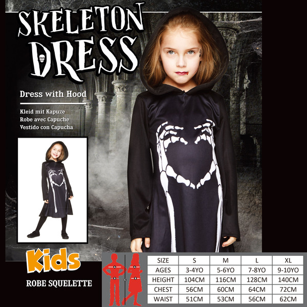 Child skeleton dress costume - perfect for any Halloween celebration! Costume includes dress with hood only (shoes, stockings and make-up effects are NOT included.) Costume is a size medium (please see sizing chart in images for more sizing information.)
