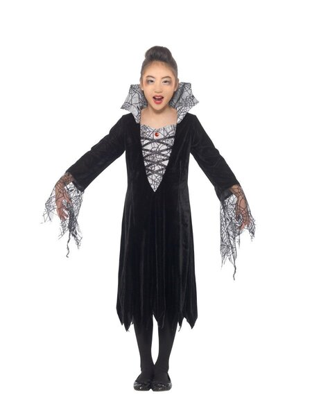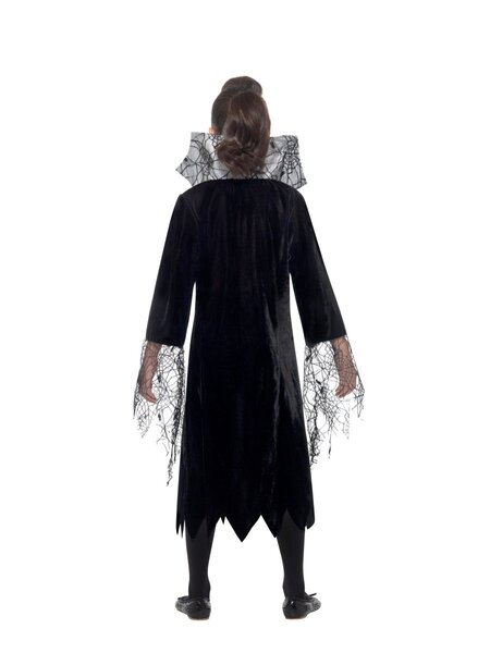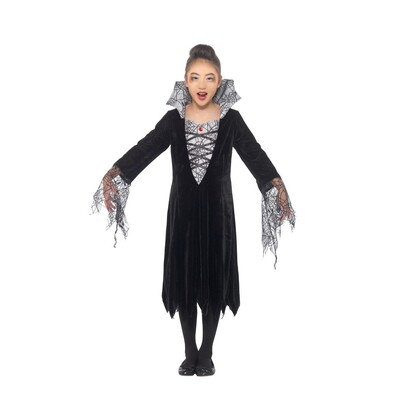 Child spider vampire costume; includes dress with attached collar. Costume is a size small (approx. 4-6 years old, 115-128cm in height - see chart in images for approximate sizing.)