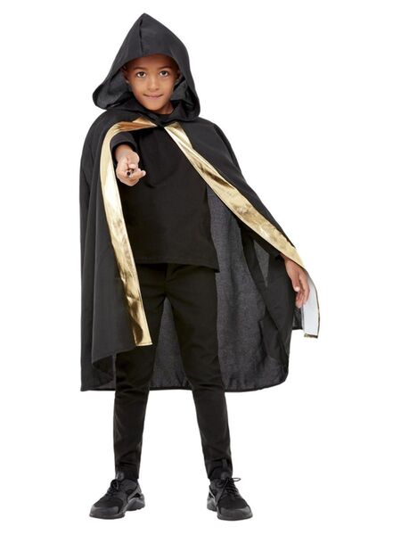 Child wizard-style black hooded cape with gold trim, designed to fit most children. 100% polyester, exc. trims.