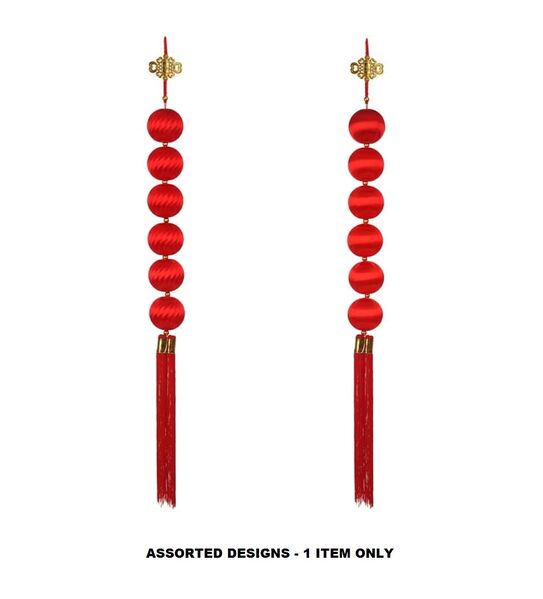 The body of the decoration incorporates a gold Chinese symbol pendant & 6 round baubles in either a plain or spiral design and is finished off with a long red tassel at the bottom.