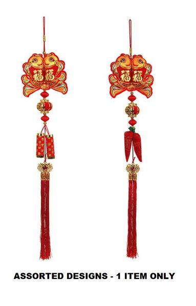 The body of the decoration incorporates a pair of padded fabric fish with lantern & red spacer beads, either 2 fabric chilli or 2 firecracker pendants and a long red tassel at the bottom.