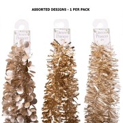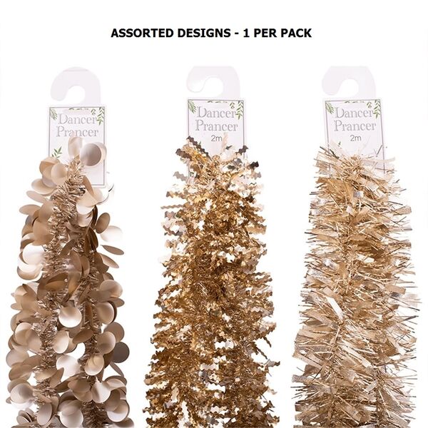 This pack contains 1 x 2m length of champagne gold foil tinsel in assorted designs - you will receive 1 piece chosen at random from available stock.