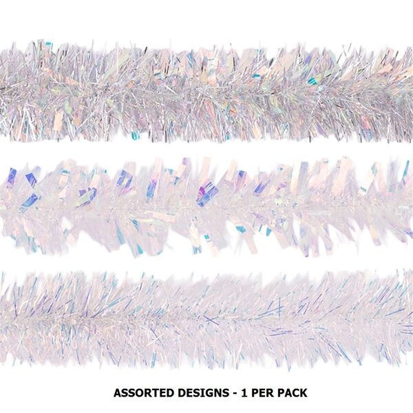 This pack contains 1 x 2m length of iridescent tinsel in assorted designs - you will receive 1 piece chosen at random from available stock.