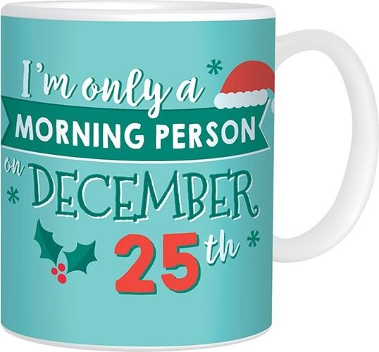 This mug is crafted from white ceramic and features a blue background with a fun 'I'm only a morning person on December 25th' message.