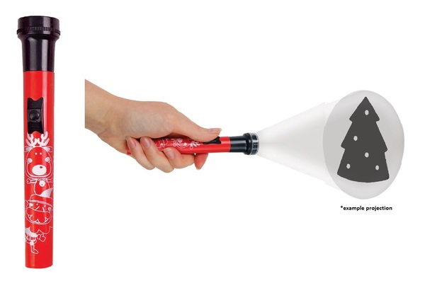 Christmas themed projector flash light, perfect for any Christmas celebration! Flash light measures approx. 15cm in length and comes with 5 Christmas themed image lenses (e.g. Santa, reindeer, holly, snowman and tree.) Requires 2 x AA batteries (not included.)