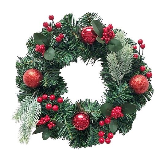Made from wired strands of faux greenery and featuring festive foliage, red baubles & red berry clusters, this versatile wreath can be used as a table centrepiece or hung on a door or wall.