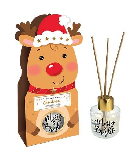 This mini diffuser includes 30ml of sweetly scented oil in a clear glass holder featuring a 'Merry & Bright' message and 3 diffuser reeds.