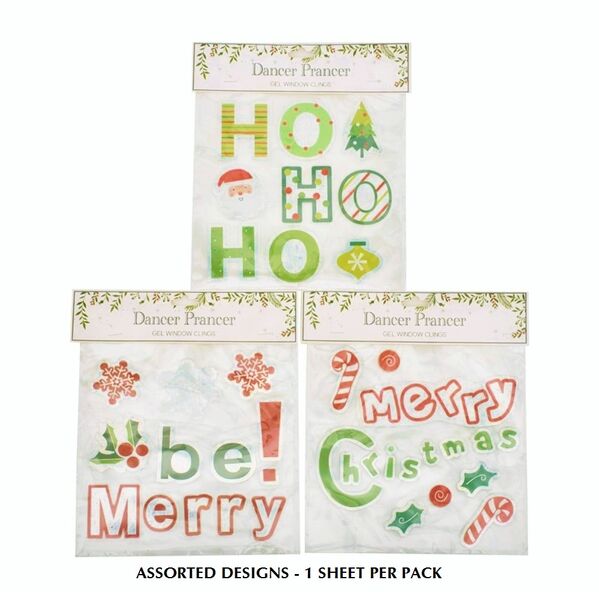 Each pack has 1 sheet of gel window clings featuring assorted Christmas slogans and designs.