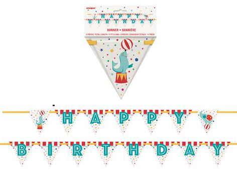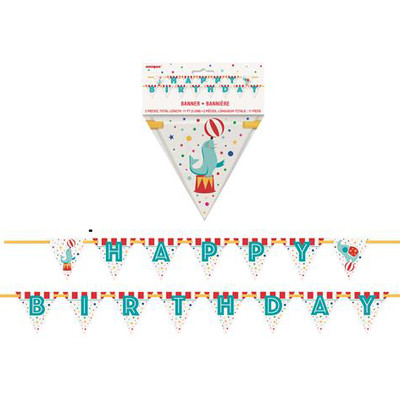 Circus carnival themed 'HAPPY BIRTHDAY' flag banner - perfect for any circus themed spectacular! Banner measures approx. 3.35m in length and individual flags on the banner measure approx. 15cm x 15cm.