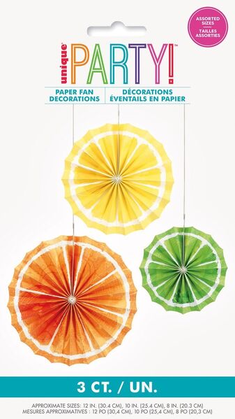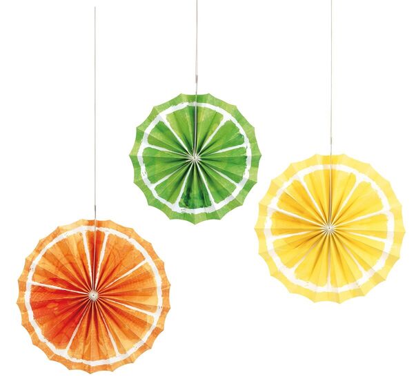 The pack contains 3 hanging paper fans resembling slices of juicy citrus - lemon, lime & orange.