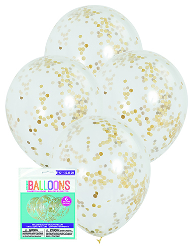 Pack of 6 clear 12in. (30cm) latex balloons with gold confetti inside. Balloons are helium quality.
