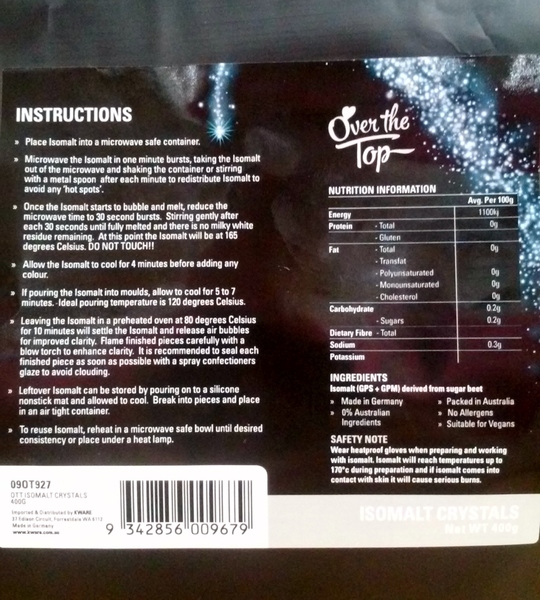 Easy to use Clear Isomalt Crystals 400g. Perfect for making amazing cake decorations such as pulled sugar, edible gems, fake ice cubes, geode crystals and custom lollipops. Instructions for melting are included on the packaging. Isomalt will not crystalise and gel colour can be added, if no colour is added Isomalt will dry clear. It can be sculpted or moulded into almost any shape using heat resitant molds.