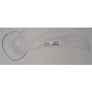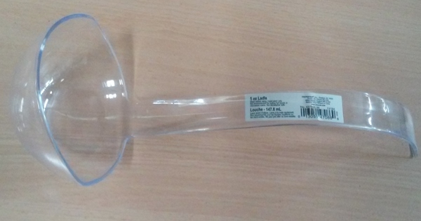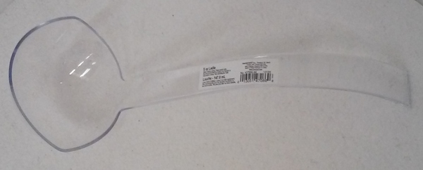 Clear plastic ladle spoon with curved handle, able to hold approx. 5oz. (147ml) of liquid. Measures approx. 28cm in total length.