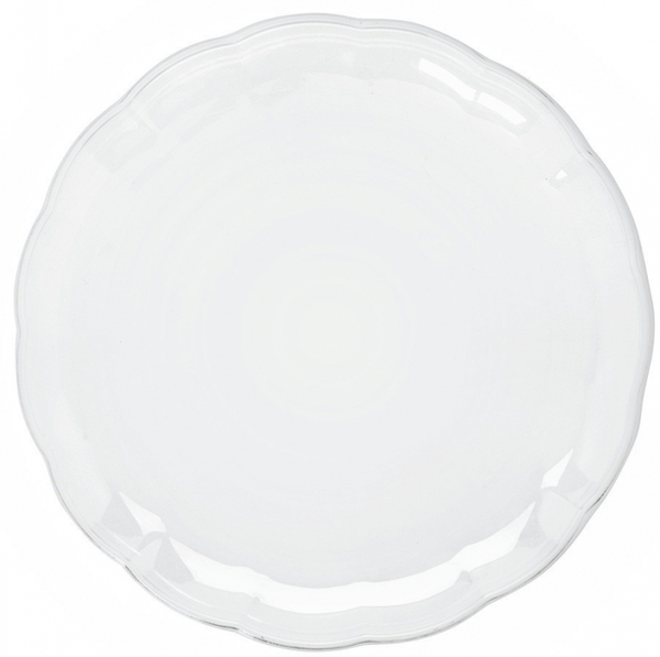 Clear plastic round tray platter with a scalloped edge, measures approx. 30cm in diameter.