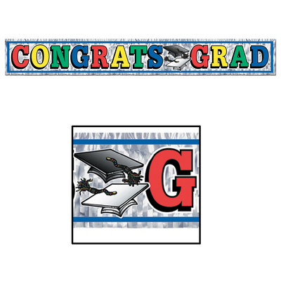 Congrats Grad metallic fringed banner, measuring approx. 20cm x 1.5m (length.)