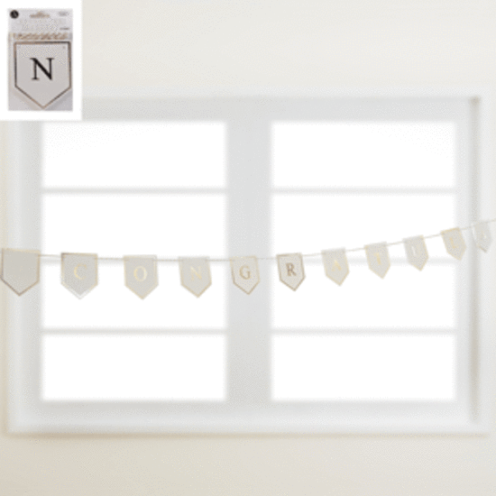 White & gold 'CONGRATULATIONS' mini bunting banner decoration, perfect for heaps of different occasions! Measures 3m in length once assembled. Individual flags measure approx. 10cm x 8cm.