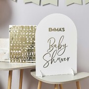 This sign is preprinted with the words 'Baby Shower' in lovely metallic gold script and has ample space at the top to personalise with the mum-to-be's name using the included gold letter stickers.