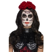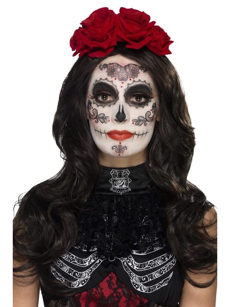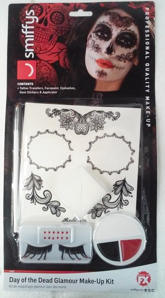 With this Day of the Dead glamour make up kit, you'll have no problem achieving a professional look! This kit includes: face tattoo transfers, face paints (white - 5g + red & black - 2g each), eyelashes, red gem stickers (12), brush and a sponge. Step-by-step instructions are included as well (to help you become an expert!) Coordinate with our costume items and your costume is bound to be a huge success!