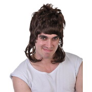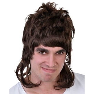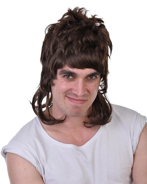 The wig is made from brown synthetic hair attached to an elastic cap that will stretch to fit most adult heads.