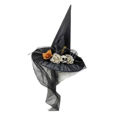 Deluxe Black Witch Hat with Skull, Flowers & Veil