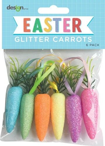 The pack contains 6 individual foam carrots covered with glitter and with green plastic tops.