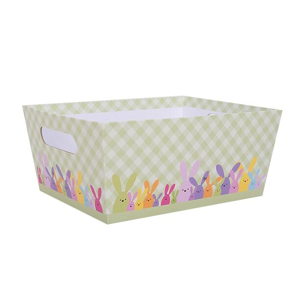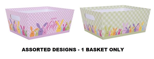 There are 2 different designs - green gingham background with a row of colourful bunnies or lilac/white spot background with bunnies and 'Happy Easter' wording. You will receive 1 basket chosen at random from available stock.